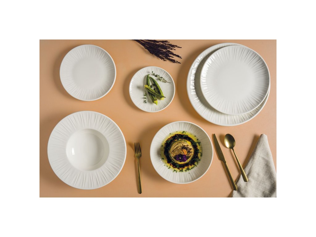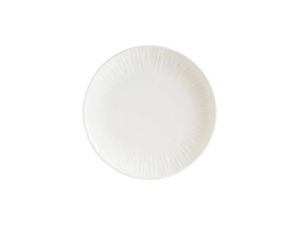 Dodejte svému stolování texturu a moderní šmrnc. Tento mělký talíř z prémiového porcelánu zaujme jemným reliéfním vzorem paprsků, které se sbíhají do středu a krásně rámují každé servírované jídlo.