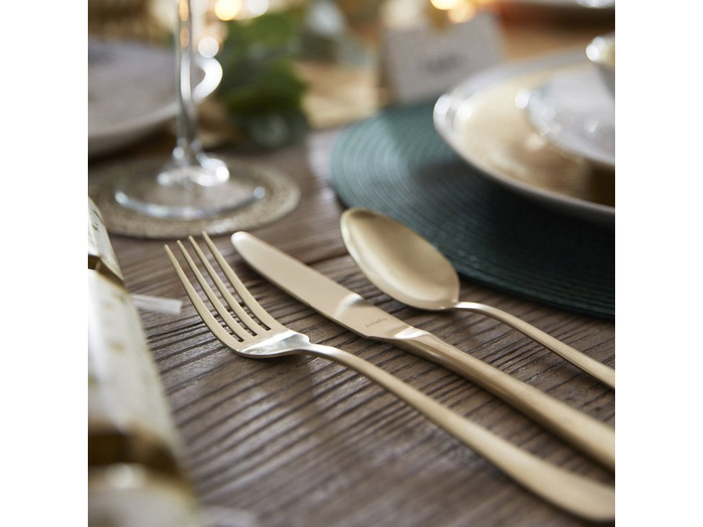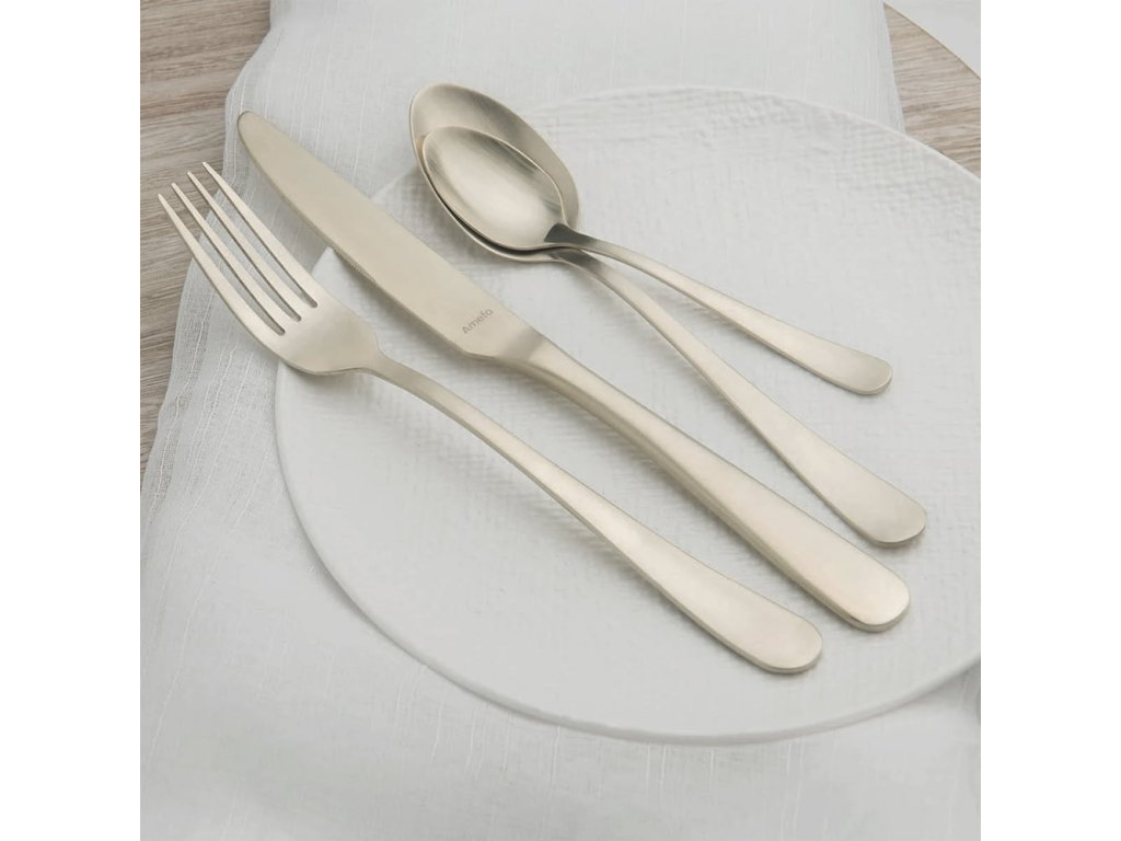 Příbory z řady Amefa Austin se vyznačují jemnou linií a hladkými křivkami. Barva "champagne" je nyní velmi trendy. Můžete ji kombinovat i s jinými kovovými odstíny. Tyto příbory vypadají velmi luxusně.